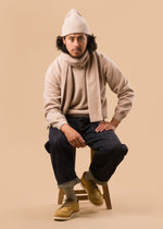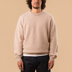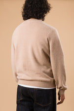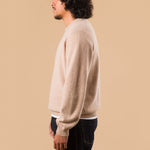 Tricoté en jauge 8 sur machine intégrale, le pull est réalisé d’un seul tenant, sans couture, pour une ligne pure et un tombé parfaitement naturel. Seul le col est ajouté manuellement.