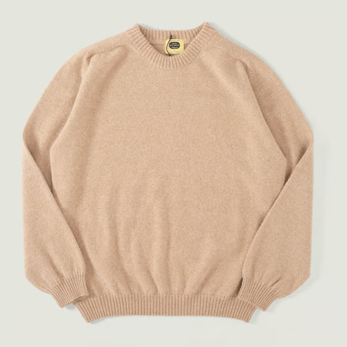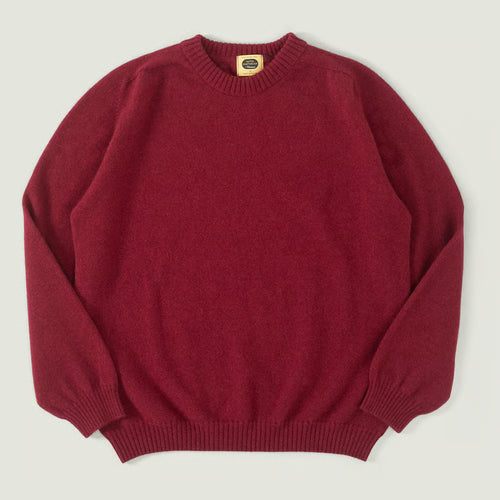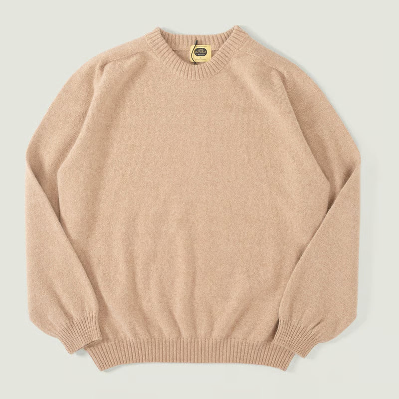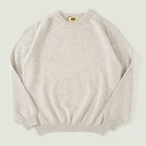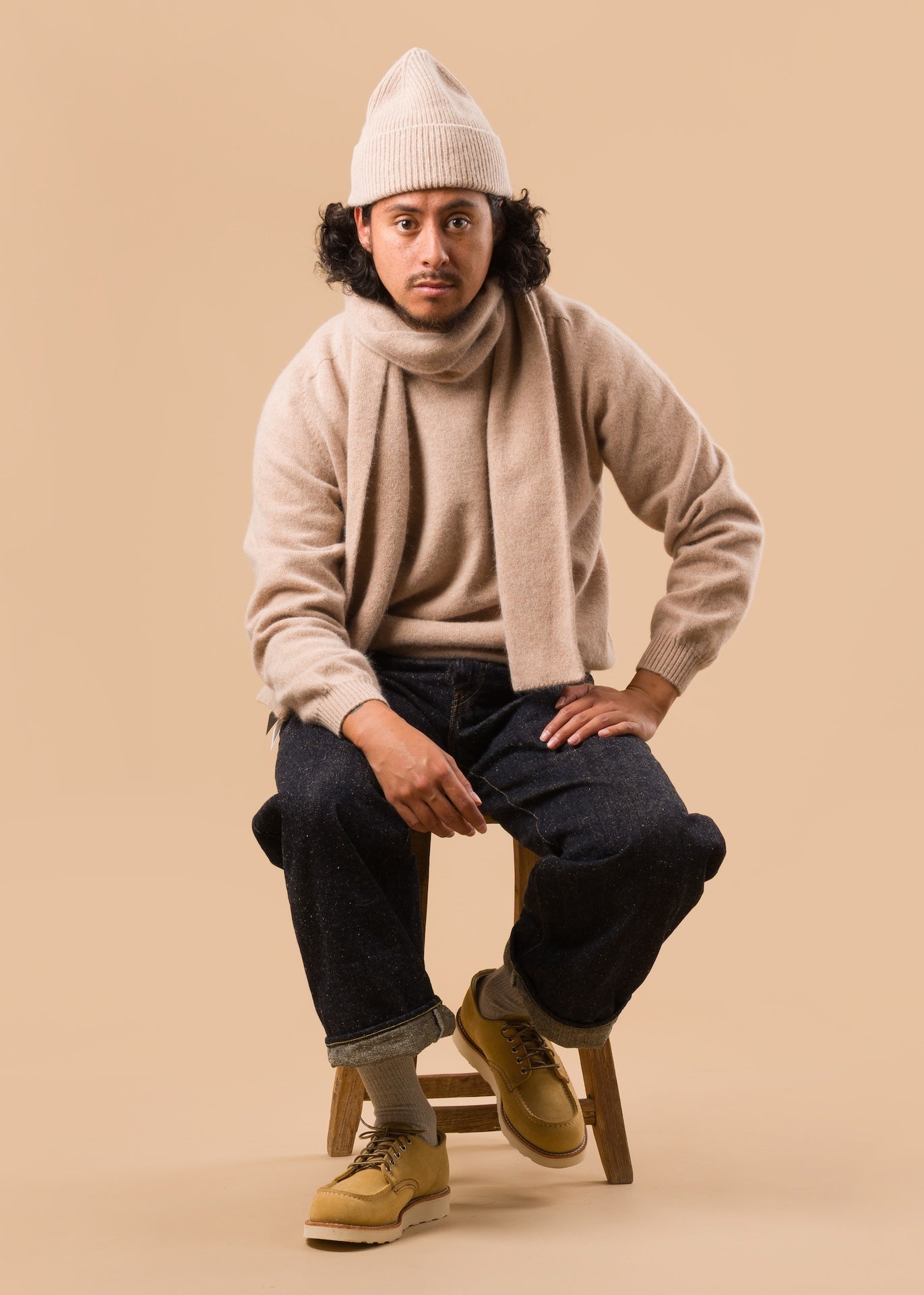 Le fil utilisé, le Geelongora, provient de la filature britannique Z. Hinchliffe & Sons. Il associe 75 % de laine d’agneau Geelong, fine et structurée, à 25 % d’angora à fibres courtes, choisi pour sa douceur et sa tenue exceptionnelle.